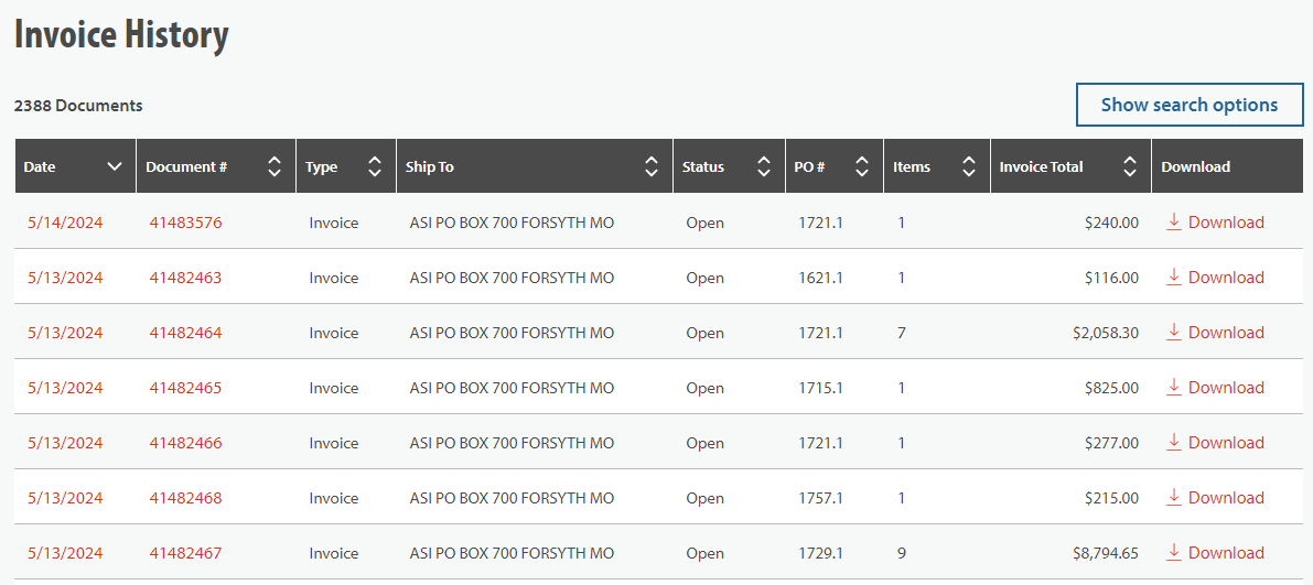 DOWNLOAD DOCUMENTS: Â Download your order acknowledgements, packing lists, invoices, and credit memos. All of these documents are available (if applicable) within the Order Details pages.