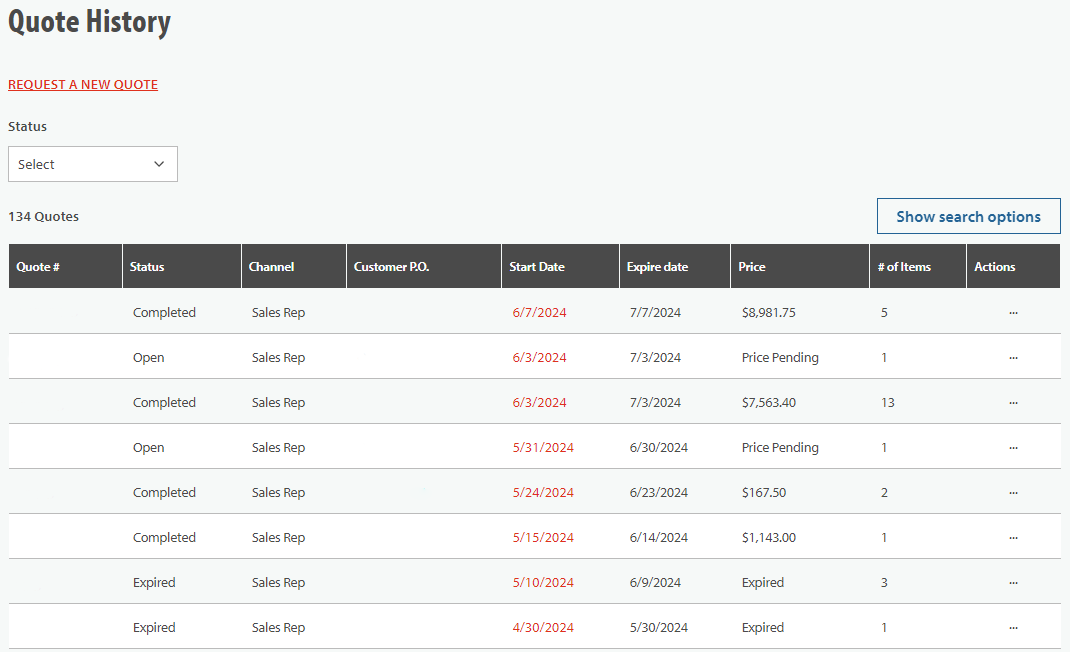 QUOTE HISTORY: Easily request new quotes, review active quotes, and convert quotes to orders if approved. You can even resubmit expired quotes to get new pricing.