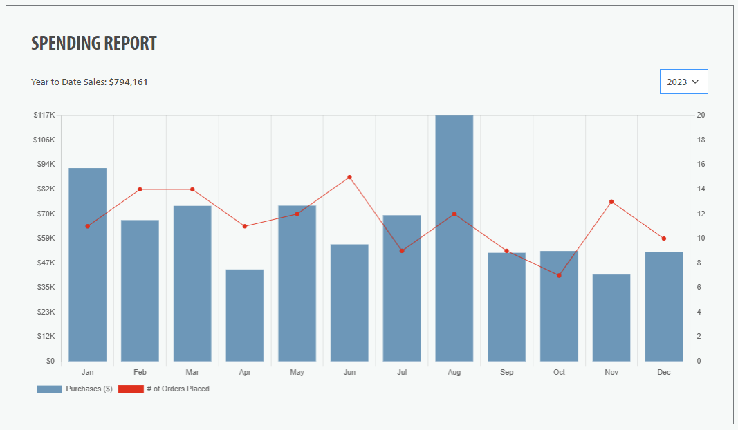 SPEND REPORTING: The Spend Reporting feature offers an interactive graph for monthly and yearly spending analysis, enabling quick visualization of purchasing patterns to enhance organizational efficiency with actionable insights.